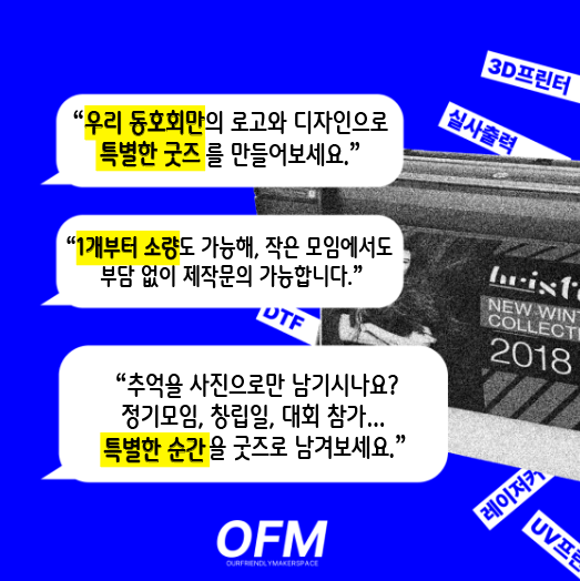 OFM 스튜디오는 디지털프린팅과 UV인쇄 기반의 소형 굿즈 제작 특화 메이커스페이스입니다.