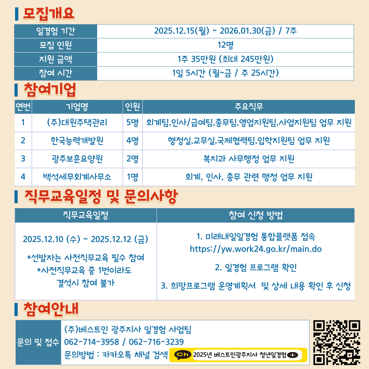 일경험 통합플랫폼 접속 → [일경험 프로그램] → [운영기관: 베스트인 광주지사] 검색 후 신청해주세요.