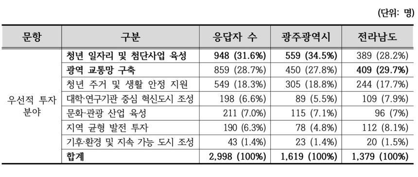 오는 7월 출범하는 전남광주통합특별시는 정부로부터 연간 5조 원씩, 4년간 총 20조 원 규모의 재정 지원을 받는다. 이번 조사는 이를 놓고 지역 청년들에게 만약 통합특별시가 20조 원 규모의 발전 투자 계획을 추진한다면 가장 우선적으로 투자해야 할 분야는 무엇이라고 생각하는지 물었다. 응답자의 31.6%가 청년 일자리 및 첨단산업 육성을 우선 투자 분야로 뽑았다. 광역 교통망 구축(28.7%), 청년 주거 및 생활 안정 지원(18.3%) 등의 답변이 뒤를 이었다.