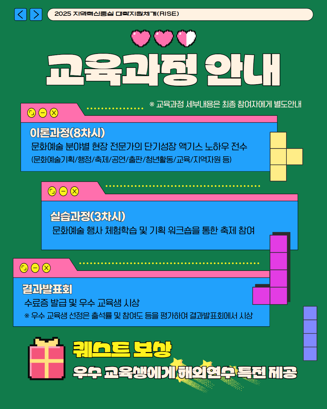 주요내용 : 이론, 실습교육 / 문화예술 분야별 현장 전문가의 단기성장 액기스 노하우 전수, 문화예술 행사 체험학습 및 기획 워크숍을 통한 축제 참여 등