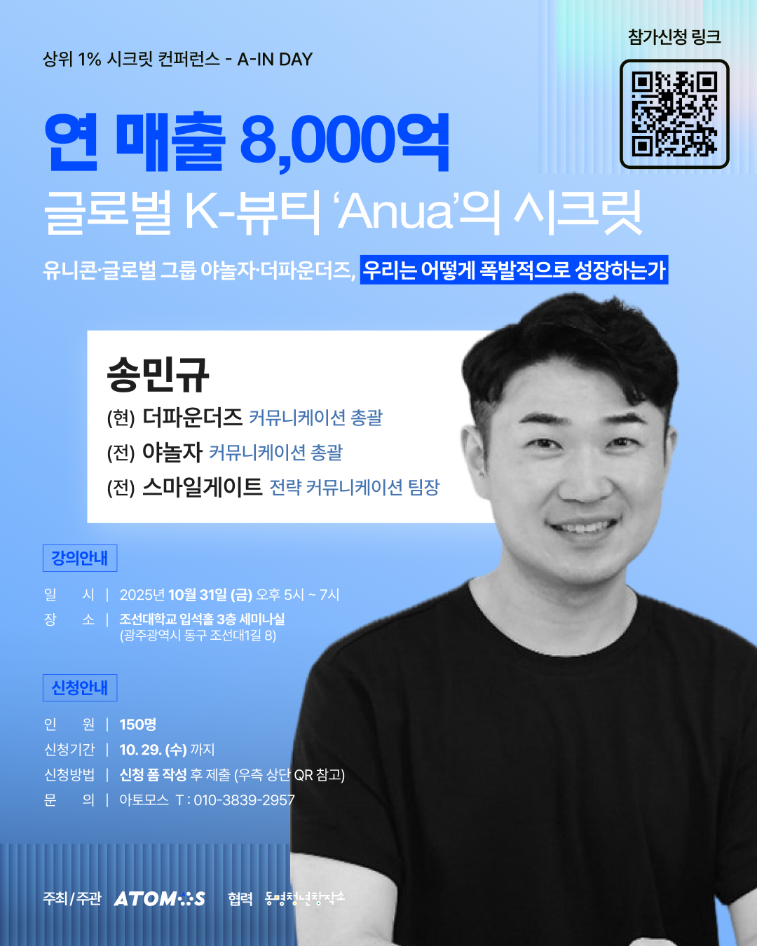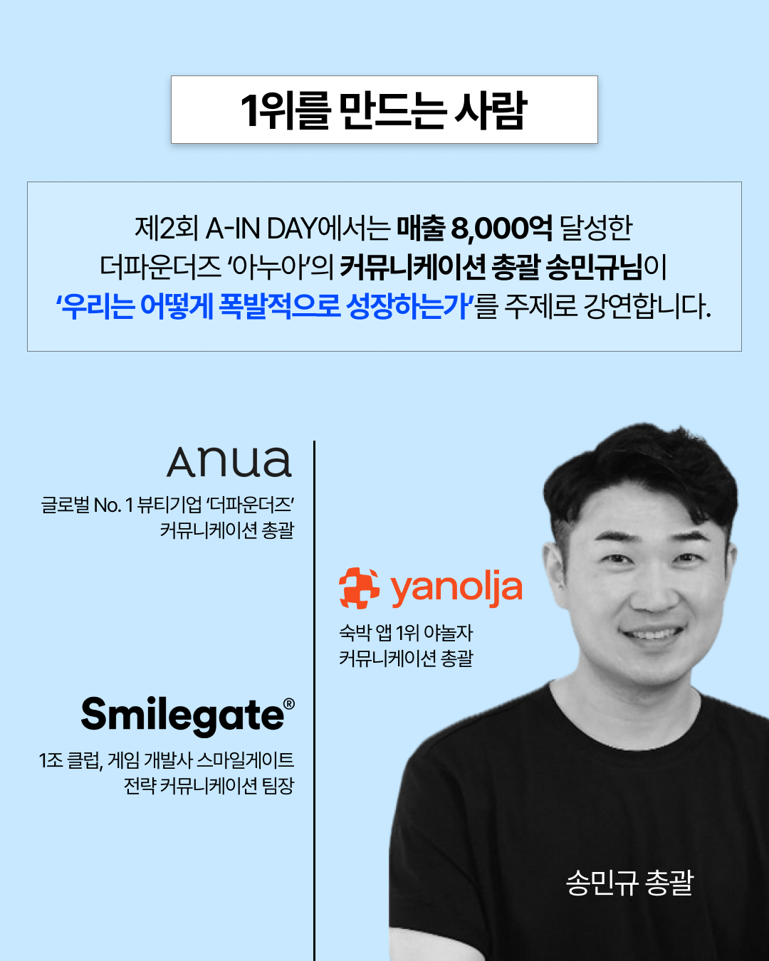 1조 클럽 게임 개발사 스마일게이트 전략 커뮤니케이션 팀장과 숙박 앱 1위 야놀자 커뮤니케이션 총괄을 거쳐 연 매출 8,000억, 글로벌 K-뷰티 브랜드 'ANUA'의 커뮤니케이션 총괄 송민규님의 강연!